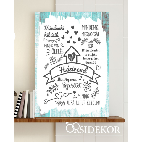 A házirend dekor tábla rendkívül modern megoldás otthonba vagy irodába. Kiváló kiegészítője lehet minden helyiségnek, hiszen nemcsak mutatós, hanem képes dekoratívan kitölteni az üres tereket, ezzel otthonossá és különlegessé teszi a látványt. A grafika