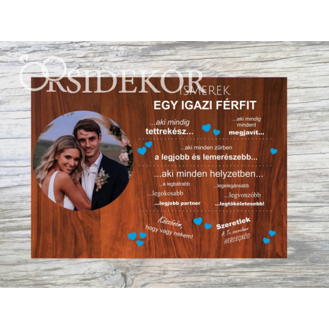 Esküvőtök alkalmával lepd meg vőlegényed egy kimondottan neki készített ajándéktáblával! Ezzel az ajándékkal mégjobban megmuthatod szereteted és hogy mit szeretsz benne igazán. A tábla mérete 21x29cm. A szöveget és a rajta lévő képet kérésed szerint ala