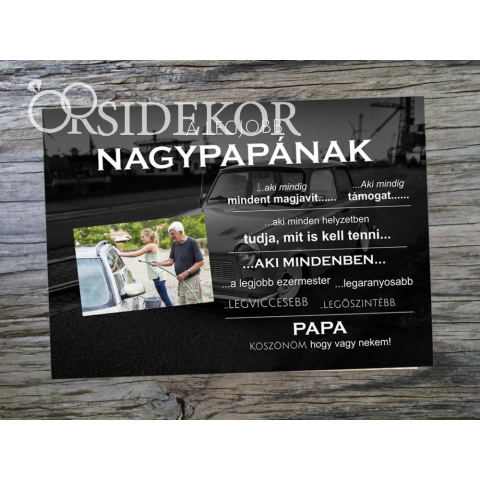 Egy kis meglepetésnek mindenki örül, pláne a Nagypapa! Lepd meg Őt ezzel az egyedi ajándékkal, hálából a sok szeretetért amit nyújt. A tábla mérete 21x29cm. A szöveget és a rajta lévő képet kérésed szerint alakítjuk. Fontos! A szövegek pozíciójának mód