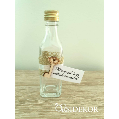 Pálinkás üveg (üresen) egyedi fa díszítéssel Ezt az üvegcsét üresen kapod, hogy azzal tölthesd meg vendégeid számára, amivel csak szeretnéd. Elsősorban pálinkát vagy magvakat ajánlunk hozzá, de a fantáziádra van bízva, hogy miből lesz köszönetajándék.