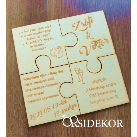 Igazán egyedi, puzzle esküvői meghívó, amellyel garantáltan emlékezetes élményt szerezhettek a meghívottaknak. Organza zsákocskában juttathatjátok el a vendégeknek, akik maguk rakhatják össze. Mérete: 14x14 cm, 4 kirakó darab Anyaga: fa A meghívó elrend