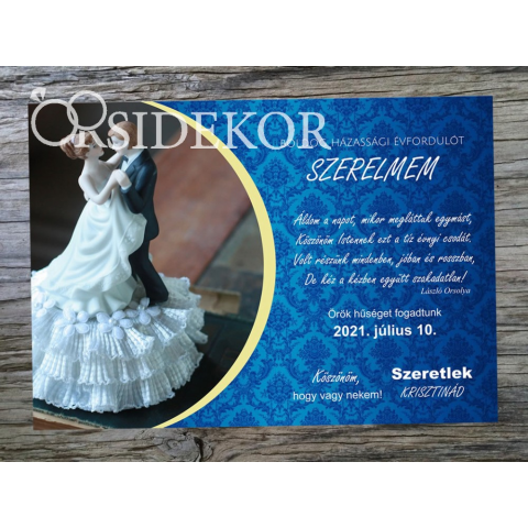 Közeleg a házassági évfordulótok? Lepd meg párod ezzel az egyedi, személyre szóló ajándékkal. A tábla mérete 21x29cm. A szöveget kérésed szerint alakítjuk. Fontos! A szövegek pozíciójának módosítására nincs lehetőség.