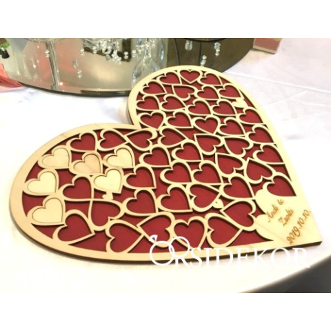 Kirakós vendégkönyv szívekkel. Rengetegen kértétek tőlünk, most végre megérkezett! A vendégek kisebb-nagyobb szíveket írhatnak alá vagy színezhetnek ki, amiket utána beraknak a keretbe. A névre szóló gravírozott felirat teszi igazán egyedivé. A szívek da