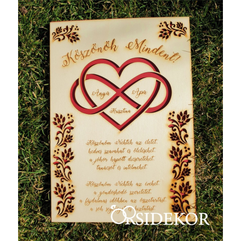 A szülőknek mondott köszönetet számtalan módon ki tudjátok fejezni. Remek módja ez a szülőköszöntő fa tábla, amire egyedi szöveget is kérhetsz. A minta kivágott, aminek a háttérszín adja meg a hangulatát, így egyedi megjelenést kölcsönöz ennek a különlege