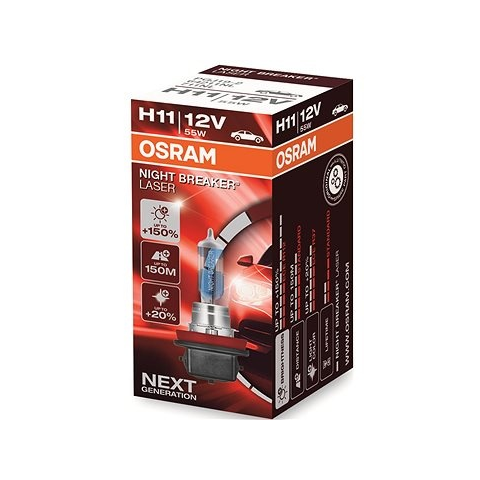 Autóizzó - H11 típusú halogén izzó, PGJ19-2 foglalattal, első lámpák és első ködlámpák számára tervezve, 55 W teljesítményű, 12 V feszültség, 1350 lm fényáram, színhőmérséklete 3200 K (meleg fehér), normál használatra OSRAM H11 Night Breaker Laser Next Generation +150% autóizzó alapvető jellemzői Ezen OSRAM halogén autóizzó remek láthatóságot biztosít a nagyobb biztonság érdekében Ideális fényhatékonyságot, remek t