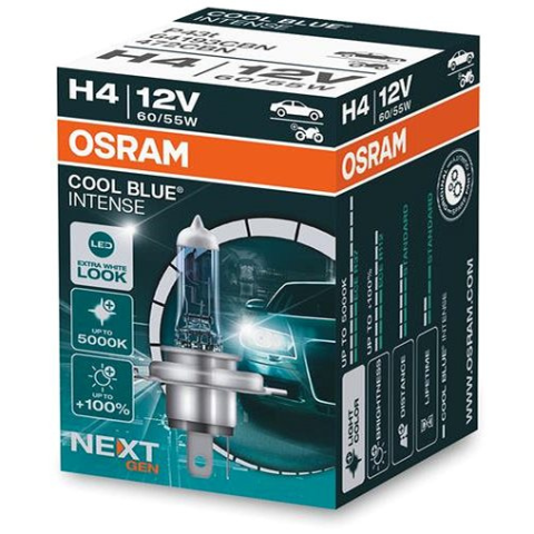 Autóizzó - H4 típusú halogén izzó, P43t foglalattal, első lámpák számára tervezve, 60 W teljesítményű, 12 V feszültség, 1650 lm fényáram, színhőmérséklete 5000 K (semleges fehér), élettartama 400 óra, normál használatra OSRAM H4 Cool Blue Intense, 12V, 60/55W, P43t, doboz autó izzó fontosabb paraméterei Ez a megbízható OSRAM halogén autó izzó biztosítja a remek láthatóságot az utakon Ideális fényhatékonyságot, kiváló