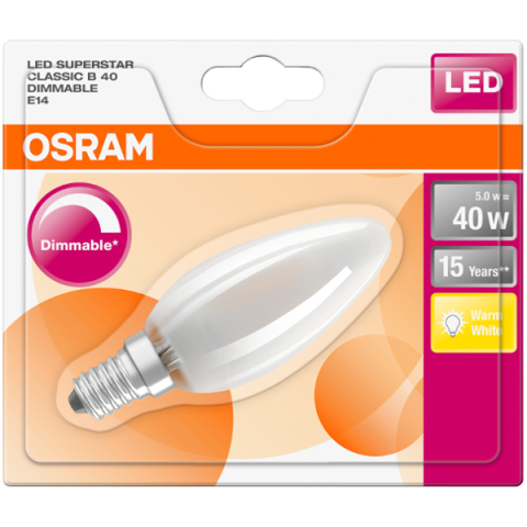 OSRAM Superstar állítható fényerővel LED gyertya, matt üveg búra, E14, 5W, 470LM, 2700K.