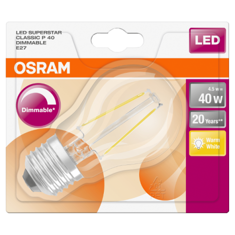 OSRAM Superstar állítható fényerővel LED kisgömb, átlátszó üveg búra, E27, 5W, 470LM, 2700K.