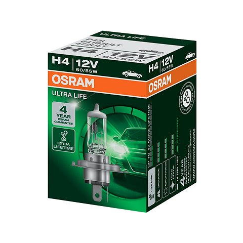 Autóizzó - H4 típusú halogén izzó, P43t foglalattal, első lámpák számára tervezve, 60 W teljesítményű, 12 V feszültség, 1650 lm fényáram, élettartama 3000 óra (165000 km), 2 db autó izzó található a csomagban, normál használatra Az OSRAM Ultra Life halogén izzók élettartama akár háromszorosa is lehet, mint a standard fényszóró izzóknak, ezért kiváló megoldás. Az OSRAM az első gyártó, amely három év garanciát vállal a halogén