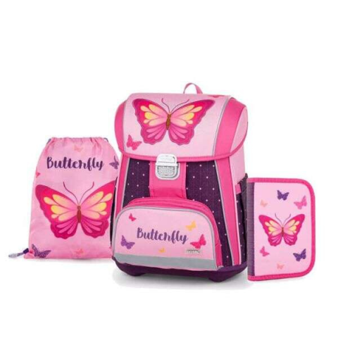 Prémium minőségű iskolatáska szett 1-3. osztályos lányoknak, szép pillangós mintával. A 3 részes szett tartalma: ergonómikus iskolatáska és hozzáillő tolltartó és tornazsák. Az elsős iskolatáska kényelmes, szellőző anyaggal párnázott ergonómikus hátki...