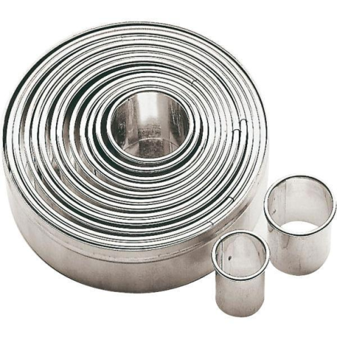 Paderno 14 darabos kerek kiszúró készlet sima éllel. A kiszúrók rozsdamentes acélból készülnek, átmérőjük 2,7–11,7 cm. Ideális cukrászoknak.