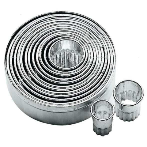 Hullámos szélű linzerkiszúró formák. A csomag 14 darab, különböző méretű kiszúró formát tartalmaz. Rozsdamentes acélból készült. Olasz termék.