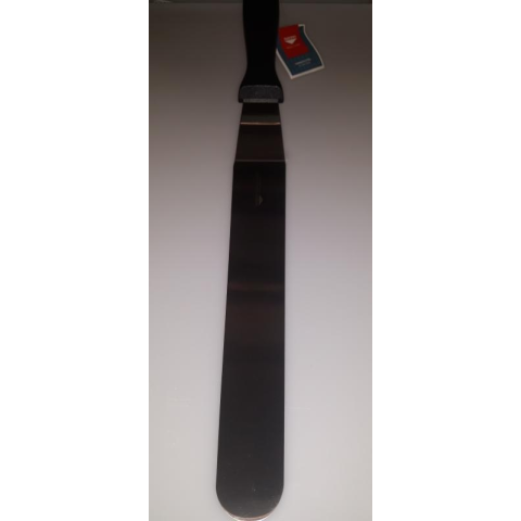 30 cm hosszú hajlított spatula, mely nemcsak palacsintasütéshez de torták díszítéséhez, ganache-ok, glazúrok kenéséhez-szétterítéséhez kiválóan alkalmas. Anyaga: minőségi rozsdamentes acél, a fogantyú műanyag. Olasz termék.