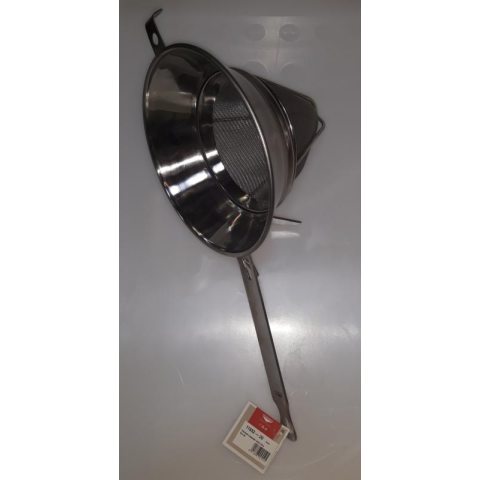 Rozsdamentes acélból készült kínai szűrő megerősített hálóval. Átmérője: 20 cm. Olasz termék.