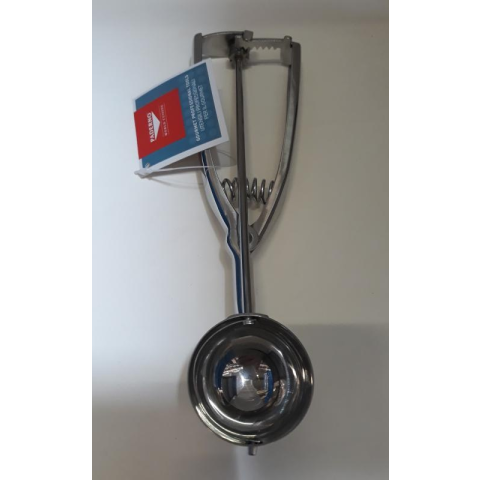 Rozsamentes acélból készült rugós fagylaltadagoló kanál. Az adagolókanál átmérője: 4,3 cm, űrtartalma: 20 ml. Olasz termék.