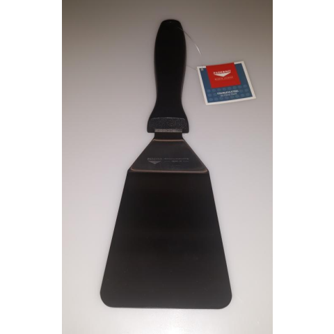 Rozsdamentes acélból készült pizza lapát (spatula), műanyag markolattal. Mérete: 15,5X8,7 cm. Olasz termék.