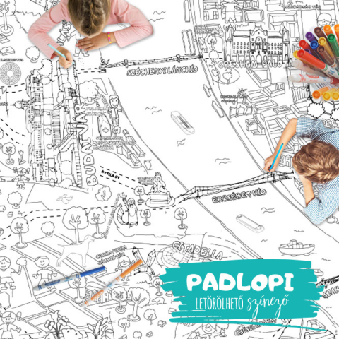 Budapest Padlopi letörölhető óriás színező Látogassátok meg Budapest legizgalmasabb helyszíneit a letörölhető Padlopi színezőn! A gyerekek az egyes nevezetességek neveit is kiszínezhetik, valamint a különböző épületeket, a Dunát, a hidakat és még sok mást