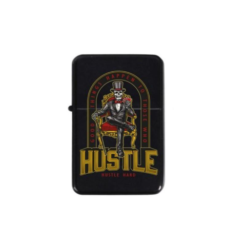 Benzines vihargyújtó az elején "Hustle" felirattal és smokingben ülő csontváz mintával. A fekete színű öngyújtó nemesacél házzal készült. A benzinnel tölthető öngyújtóval semmi más nem tudja felvenni a versenyt ha szeles idő van. A benzines öngyújtók üres állapotban kerülnek forgalomba, ezért érdemes hozzájuk egy benzint is vásárolni.Méretek:5,6 x 3,8 x 1,3 cmSúly: 55 g