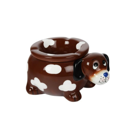 Vidám, fehér foltos, barna kutyát ábrázoló kerámia hamutartó. Két részből áll, ami megakadályozza, hogy a szél kifújja belőle a hamut vagy csikkeket.Méretek:Szélesség: 17 cmMagasság: 9,5 cmSúly: 560 gramm