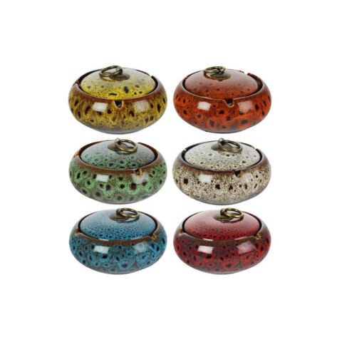 Közepes méretű, 6 féle színben, kerámia hamutartó, gyökérfa mintákkal. A hamutartónak van egy fém fogantyúval ellátott, levehető teteje, ami megakadályozza, hogy a szél kifújja belőle a hamut vagy csikkeket.A doboz 6 db hamutartót tartalmaz.Méretek:Átmérő: 10,5 cmMagasság: 5,2 cmSúly: 358 grammVan lehetőség a hamutartókat egyesével is megrendelni, viszont az egész doboz megvásárlása esetén kedvezőbb az ára. Viszonteladói árakhoz kérjük