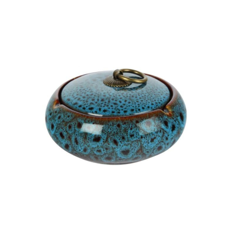Közepes méretű, kék színű kerámia hamutartó, gyökérfa mintákkal. A hamutartónak van egy fém fogantyúval ellátott, levehető teteje, ami megakadályozza, hogy a szél kifújja belőle a hamut vagy csikkeket.Méretek:Átmérő: 10,5 cmMagasság: 5,2 cmSúly: 358 gramm