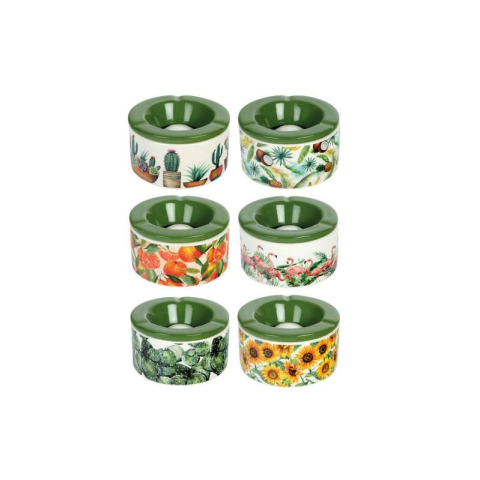 Közepes méretű kerámia hamutartó, fehér alapon 6 féle mintával, zöld színű peremmel. Két részből áll, ami megakadályozza, hogy a szél kifújja belőle a hamut vagy csikkeket.Viszonteladói partnereink részére: Kérjük előtte regisztráljon. Lehetőség van a hamutálakat egyesével is megrendelni, de egész doboz esetén kedvezőbb az ára.Méretek:Átmérő: 11,5 cmMagasság: 6,6 cmSúly: 377 gramm