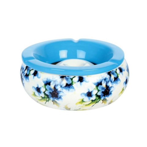 Nagyméretű kerámia hamutartó sötétkék, virágmintás. Két részből áll, ami megakadályozza, hogy a szél kifújja belőle a hamut vagy csikkeket.Méretek:Átmérő: 20 cmMagasság: 8.3 cmSúly: 483 gramm