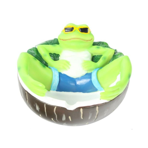 Zöld, napszemüveges, pihenő békát ábrázoló kerámia hamutartó, amely 3 szál cigaretta részére biztosít helyet. Ajándéknak is tökéletes választás.Méretek: 13,5 x 8 cm