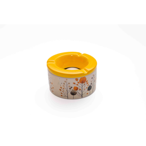 A Padonio márkájú modern hamutartó elegáns, világos alapon őszi hangulatú, színes növényi motívumokkal díszített külső dizájnjával nemcsak praktikus kiegészítő, hanem dekoratív eleme is lehet otthonának vagy teraszának. A szélálló kialakítás és a levehető, élénk sárga felső perem megakadályozza a hamu szétszóródását, így beltéren és kültéren egyaránt megbízható használatot biztosít.11 cm-es átmérője és 6 cm-es magassága kényelmes, stabil m