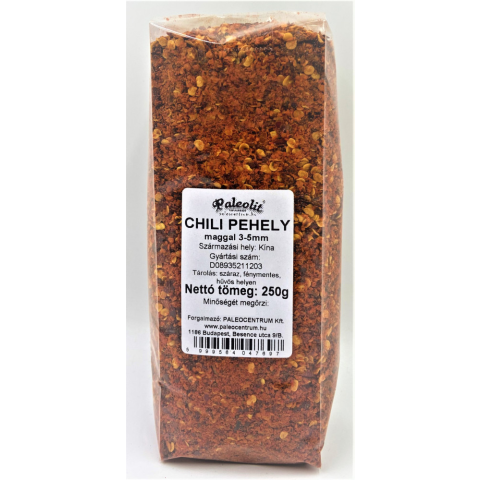 3-5 mm nagyságú chili pehely maggal. Kiváló alapanyag húsételek, szószok, levesek ízesítséhez.Származási hely: Kína