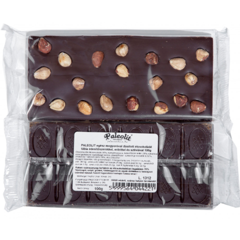 Egész mogyoróval dúsított, eritrittel édesített csokoládé 70% kakaótartalommal.Egészséges és finom nassolnivaló. Összetevők: étcsokoládé (kakaómassza, édesítőszer: eritrit (28%), kakaóvaj, emulgeálószer: napraforgó lecitin, édesítőszer: szteviol glikoz