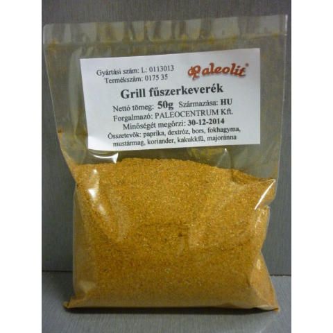 Paleolit Grill fűszerkeverék 50g Összetevők: curry, paprika, bors, fokhagyma, mustármag, koriander, kakukkfű, majoranna, vöröshagyma.Felhasználási javaslat: Kiválóan alkalmas grill ételek előfűszerezéséhez.Kiszerelés: 50g