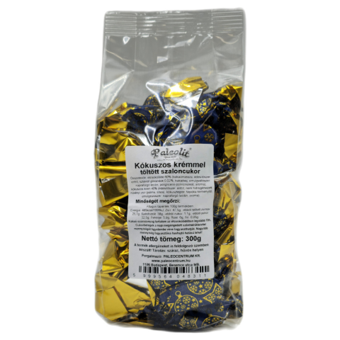 Paleolit Kókuszos szaloncukor 300g krémmel töltve Összetevők: étcsokoládé 50% (kakaómassza, édesítőszer: eritrit(14%), kakaóvaj, emulgeálószer: napraforgó lecitin, édesítőszer:szteviol glukozidok(0,02%)), kókuszos krém 50% (édesítőszer: eritrit(20%), n