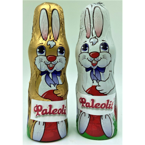 Paleolit húsvéti figura kókusztejporos csokoládéból édesítőszerrel 25g Összetevők: édesítőszer: maltit (37,7%), kakaóvaj, kakaómassza, tápióka keményítő, kókusztejpor, emulgeálószerek: napraforgó lecitin, poliglicerin-poliricinoleát, vanília aroma.Fö