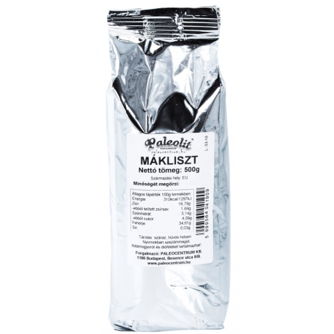 Zsírtalanított mák őrleménye, fényvédő csomagolásban. Ez a termék elsősorban a paleolit táplálkozás megkönnyítésére jött létre, de más allergéneket kerülő és alacsony szénhidráttartalmú diétába is remekül beilleszthető. A kiváló minőségű, homoktól és