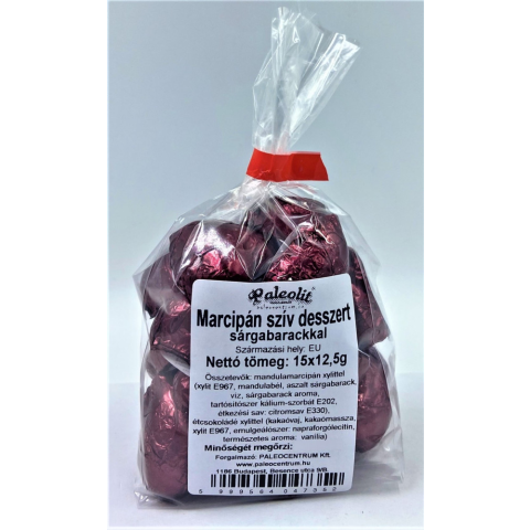 Sárgabarackkal ízesített marcipán szív desszert. Összetevők: mandulamarcipán xylittel (xylit E967, mandulabél, aszalt sárgabarack, víz, sárgabarack aroma, tartósítószer kálium-szorbát E202, étkezési sav: citromsav E330), étcsokoládé xylittel (kakaóvaj