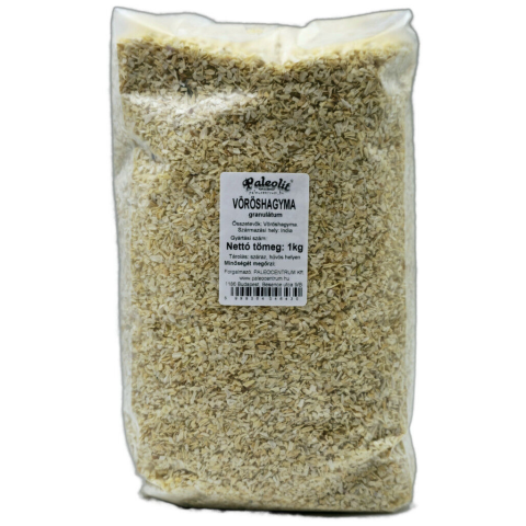 Vöröshagymából készített granulátum, kíméletesen szárított, jól megőrzi az értékes tápanyagokat. Felhasználási javaslat: Minden olyan ételbe való, amiben friss vöröshagymát használunk. Használhatjuk saját fűszerkeverékek egyik összetevőjeként is.