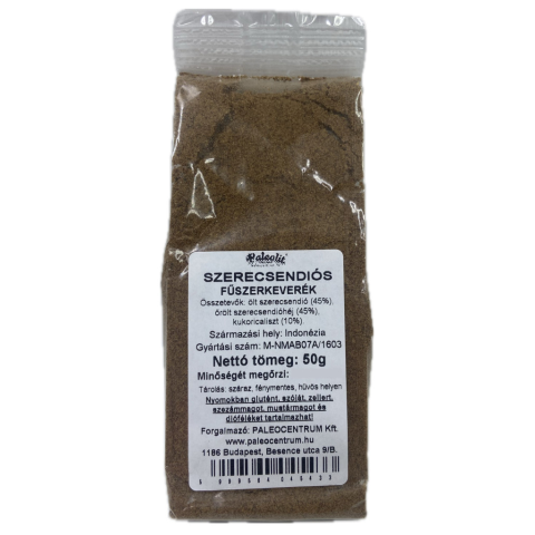 Összetevők: őrölt szerecsendió (45%), őrölt szerecsendióhéj (45%), kukoricaliszt (10%). Származási hely: IndonéziaNyomokban glutént, szóját, zellert, szezámmagot, mustármagot és dióféléket tartalmazhat!