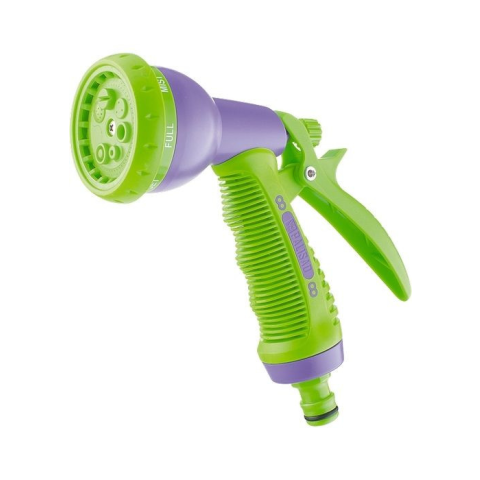 Szórópisztoly fojtószeleppel és kioldóval. Állítható fúvókával van felszerelve, amely hat öntözési módot biztosít: zuhany, köd, kúpos, központi, lapos-vízszintes, kemény vizsugár. Indítózárral rendelkezik a folyamatos mûködéshez. Mindenféle öntözéshez