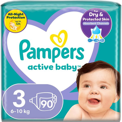 Eldobható pelenka - hagyományos pelenka, méret 3, gyermek súlya 6 - 10 kg, 90 darab a csomagban, nedvességfelszívó csatornák és rugalmas szalag, Pampers Active Baby sorozat Gyermeked elégedettségével szorosan összefügg a szárazság érzése. A hagyományos típusú PAMPERS eldobható pelenka a kiváló Pampers Active Baby sorozatból nem fogja korlátozni a kisbabát és gondoskodik