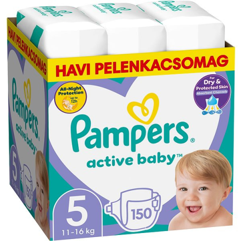Eldobható pelenka - hagyományos pelenka, méret 5, gyermek súlya 11 - 16 kg, 150 darab a csomagban, rugalmas szalag, anyaga pamut, Pampers Active Baby sorozat Készen állsz a forradalmian új pelenkákra? A Pampers Active Baby pelenkák első használatától kezdve észreveheted, hogy különböznek korábbi pelenkáinktól. Forradalmi technológiájuk segíti a nedvesség e