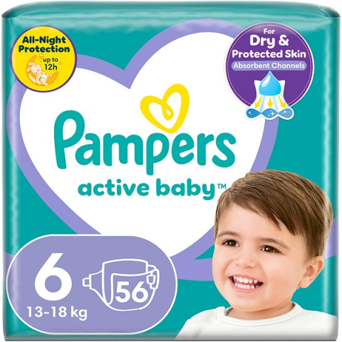 Eldobható pelenka - hagyományos pelenka, méret 6, gyermek súlya 13 - 18 kg, 56 darab a csomagban, nedvességfelszívó csatornák és rugalmas szalag, Pampers Active Baby sorozat Abban, hogy gyermeked elégedett legyen, fontos szerepe van a szárazság érzésének. A hagyományos dizájnú PAMPERS eldobható pelenka a nagyszerű Pampers Active Baby sorozatból nem fogja korlátozni a kisb