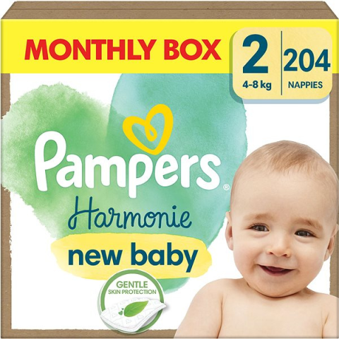 Eldobható pelenka - öko pelenka és hagyományos pelenka, méret 2, gyermek súlya 4 - 8 kg, 204 darab a csomagban, nedvességfelszívó csatornák, nedvességjelző, ergonómikus abszorbens mag, hipoallergén, pelenkakiütés elleni védelem, rugalmas szalag, extra légáteresztő, parfümmentes és klórmentes, anyaga pamut, Pampers Harmonie sorozat A kényelem jegyében tervezett pelenkákA Pampers Harmonie Baby eldobható pelenkák kényelmet és jobb védelmet biztosítanak babád számá