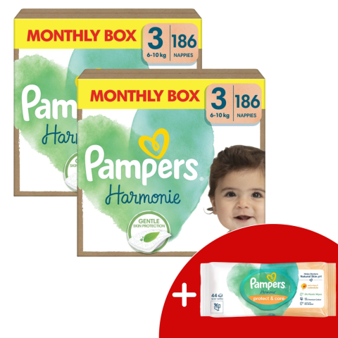 1 kép Pampers Harmonie havi Pelenkacsomag 6-10kg Midi 3 (2x186db) + Ajándék Törlőkendő