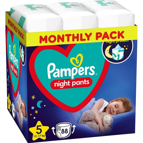 Bugyipelenka - eldobható, mérete 5, 12-17 kg súlyú gyermekek számára, felhúzható, mesés motívum, 88 db a csomagban Aktív gyermekek számára ideális pelenkabugyikA Pampers Night Pants pelenkabugyik kényelmet és fokozott védelmet nyújtanak gyermekednek az éjszaka során. A pelenkabugyik megerősített maggal rendelkezne