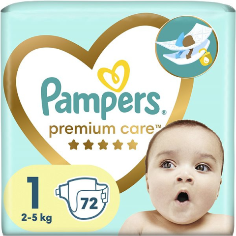 Eldobható pelenka - hagyományos pelenka, méret 1, gyermek súlya 2 - 5 kg, 72 darab a csomagban, pelenkakiütés elleni védelem, anyaga pamut, Pampers Premium Care sorozat Pampers Premium Care pelenkák1-es méret (2-5 kg), 72 dbA babák bőre akár kétszer olyan érzékeny is lehet, mint a felnőtteké, ezért speciális gondoskodást igényel. A Pampers Premium Care pelenkák puha
