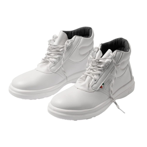 Fehér munkavédelmi bakancs, S2-es védelmi szinttel, mérsékelten vízlepergető felsőrésszel. Orrában acél lábujjvédő található. Talpában nem található átszúrás elleni védelem. Fehér munkavédelmi bakancs, S2 minősítéssel A bakancs orrában acél lábujjvédő