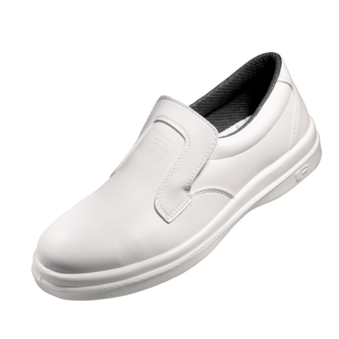 Védelem nélküli, fehér színű bebújós mokasszin, antibakteriális Sanitized belső béléssel. A cipő nem tartalmaz lábujjvédőt és talpátszúrás elleni védelmet sem. Talpa olaj és üzemanyagálló, csúszásgátló, antisztatikus. Bebújós fehér védelem nélküli mok