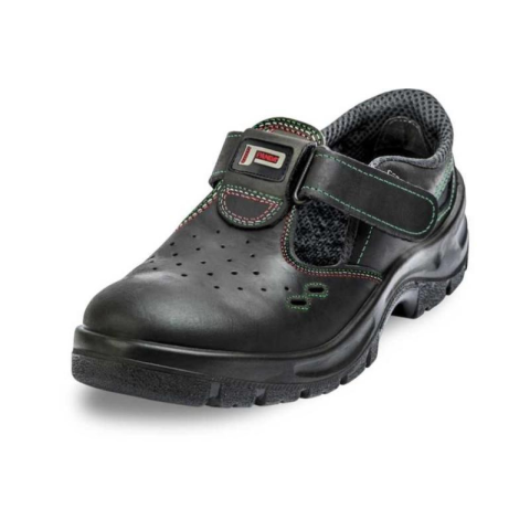 Biztonsági szandál acél orrmerevítővel, antisztatikus, csúszásgátló és üzemanyagálló talppal, energiaelnyelő sarokrésszel és lélegző bőrből készült felsőrésszel.