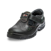 Biztonsági szandál acél orrmerevítővel, antisztatikus, csúszásgátló és üzemanyagálló talppal, energiaelnyelő sarokrésszel és lélegző bőrből készült felsőrésszel.